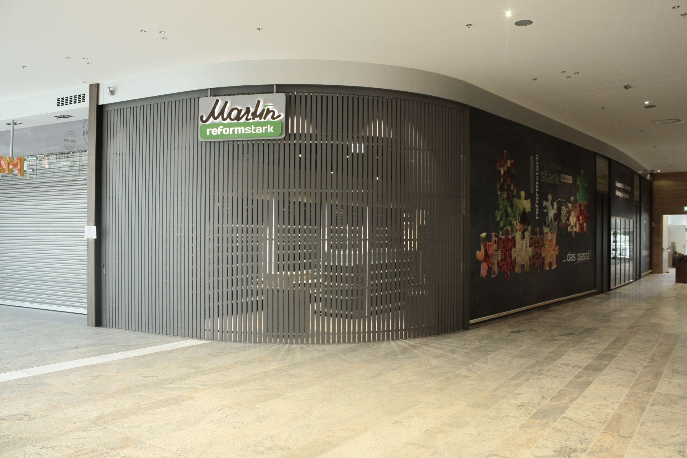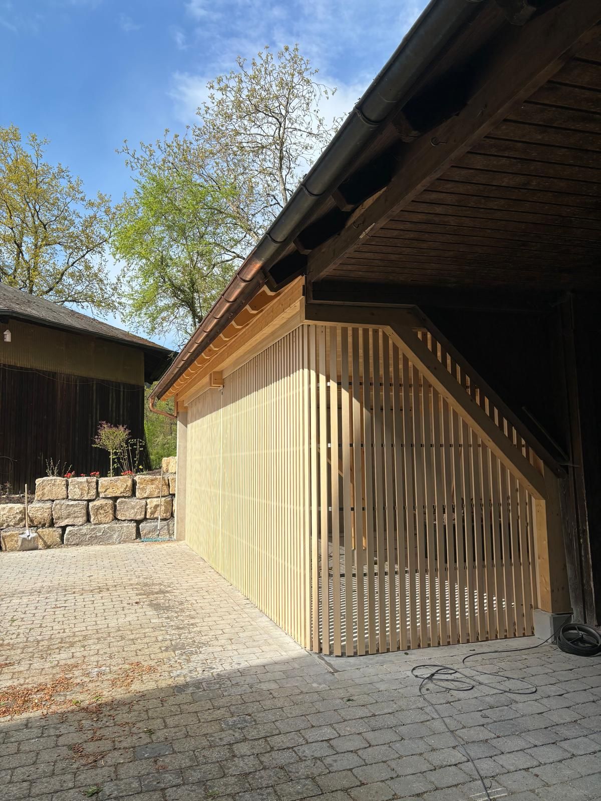 Zur Verbindung der Lamellen verwenden wir dauerelastische Bänder aus V2A-Edelstahl. Die Deckenschiene besteht aus feuerverzinktem Spezialstahl, während für die Bodenschiene wieder V2A-Edelstahl zum Einsatz kommt. Wir achten beim Zukauf der verwendeten Materialien sehr auf kurze Wege, umweltverträgliche Herstellung und faire Bedingungen. Bei Holz sind uns zusätzlich Herkunft, Qualität, Beschaffenheit wichtig.